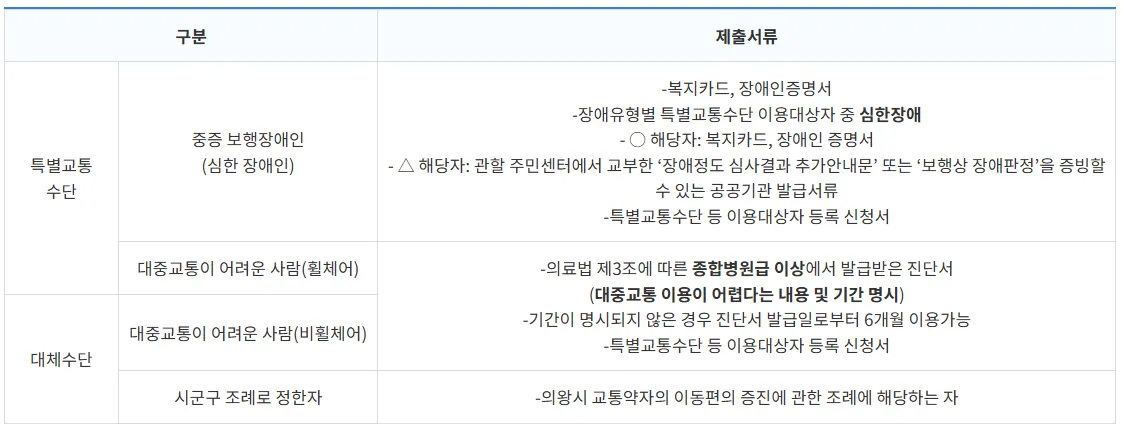 바우처택시(대체수단) 이용대상자는 휠체어를 사용하지 않지만, 의학적 진단서를 통해 대중교통을 이용하기 어렵다고 인정된 사람들입니다. 이 경우, 시군에서 운영하는 바우처 택시나 임차 택시만 이용할 수 있고, 시군별 콜센터에 연락해서 증빙자료를 제출하고 이용자로 등록해야 합니다.