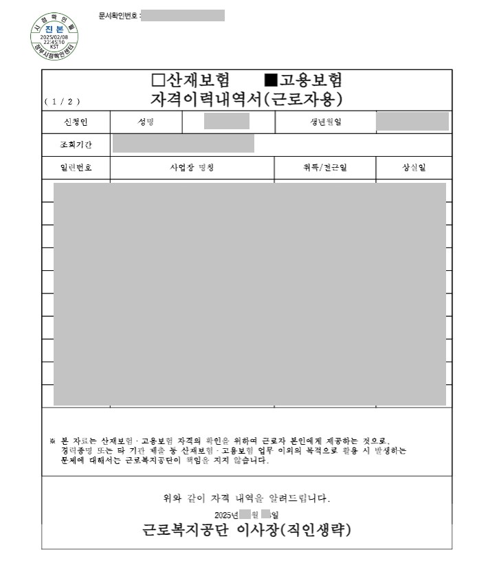 ✅ 고용보험 가입 이력: 가입 일자, 고용보험 적용 사업장(회사명), 이직 사유