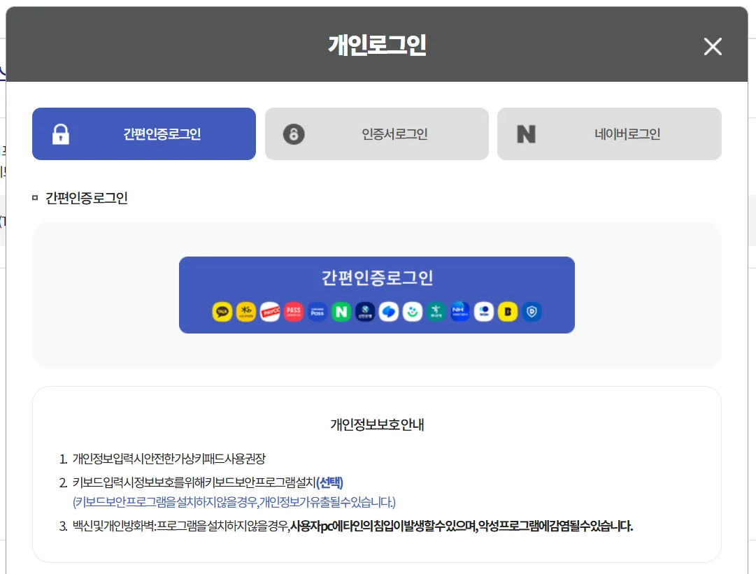 - 공인인증서(공동인증서), 간편인증(카카오, 네이버 인증서 등)으로 로그인 후 조회할 수 있습니다.