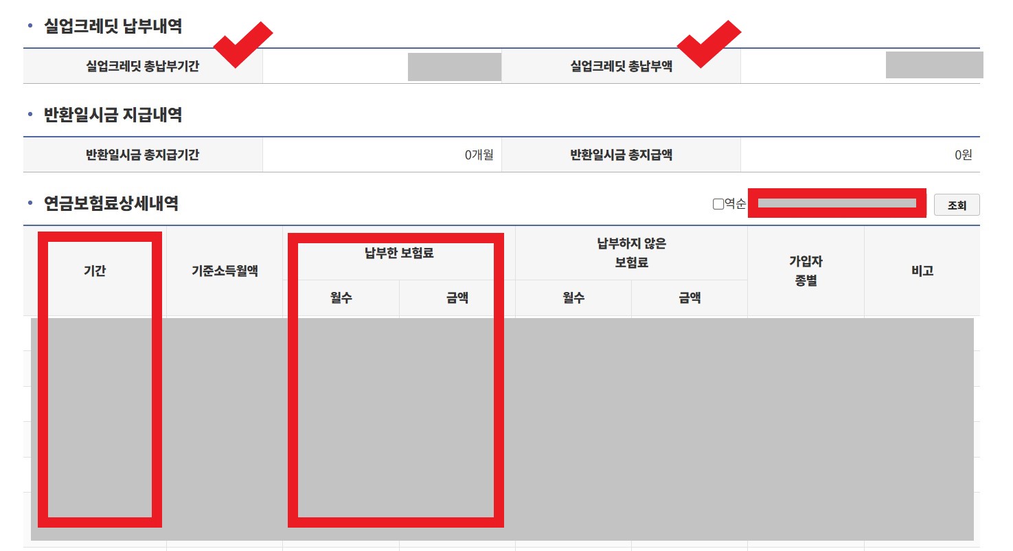 - 실업크레딧 납부내역과 연금보험료 상세내역도 확인할 수 있습니다.