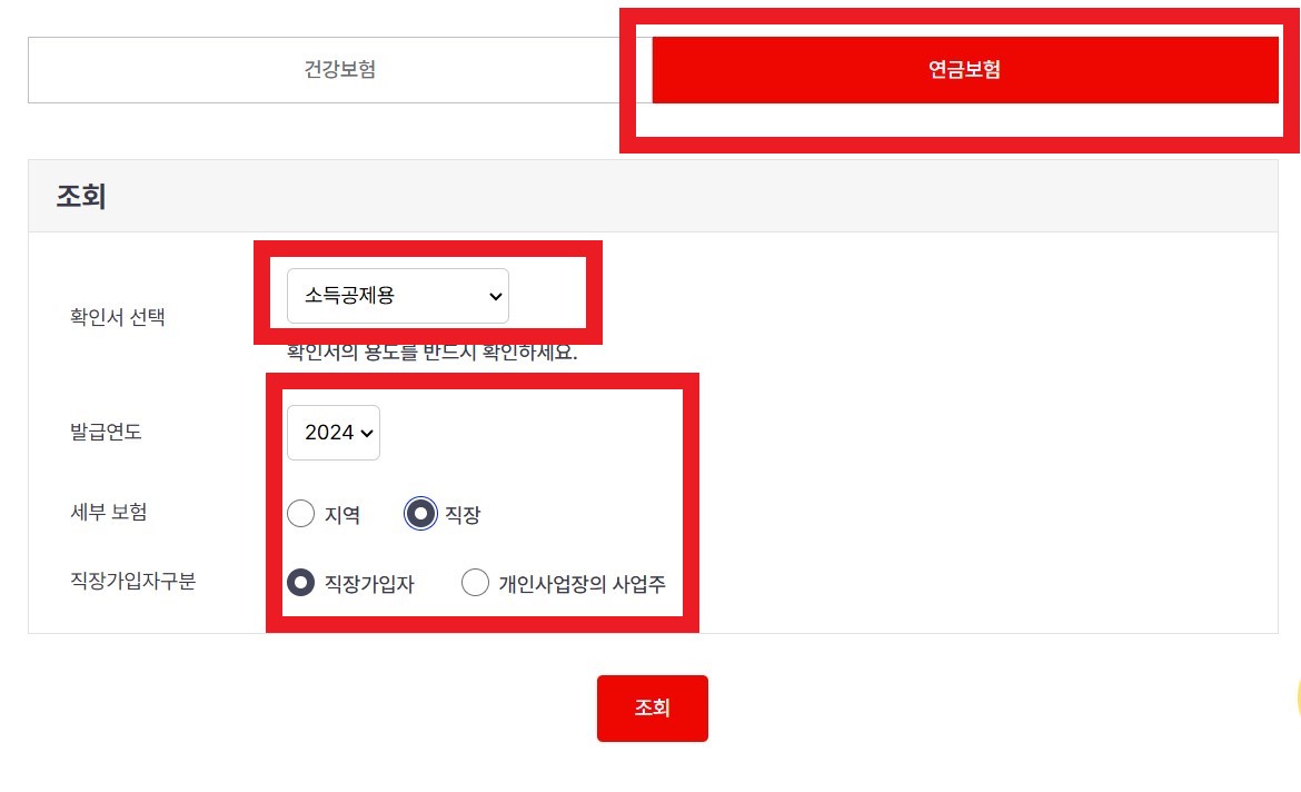 4. '연금보험'과 확인서 용도 등 세부사항을 선택합니다.