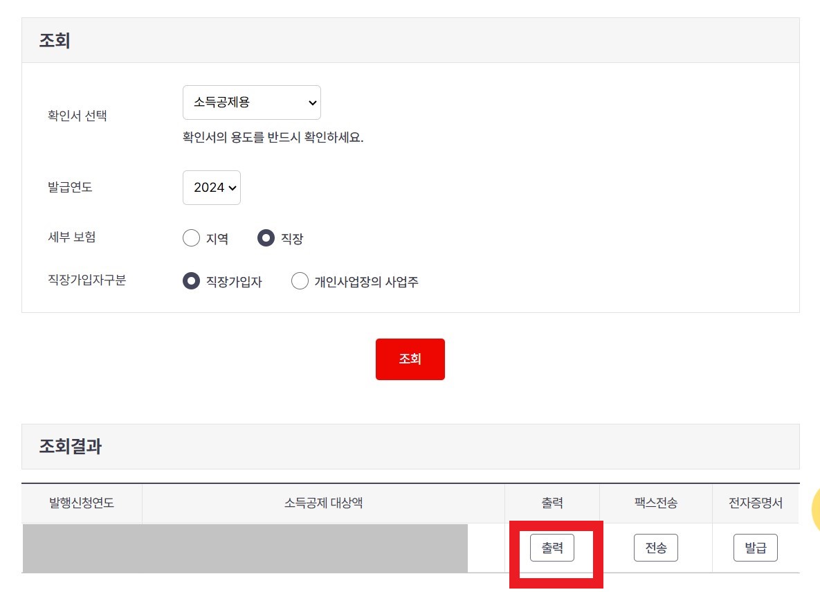- 발급을 원하는 년도를 선택합니다.(1년 단위로 출력가능)