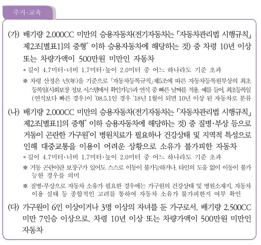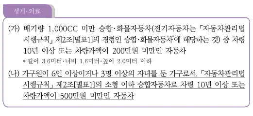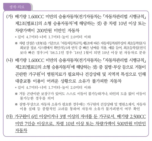 - 배기량이 2,000cc 이하인 승용차 중, 스스로 거동이 어려운 가구원 치료를 위해 꼭 필요하고, 대중교통 이용이 어려운 경우