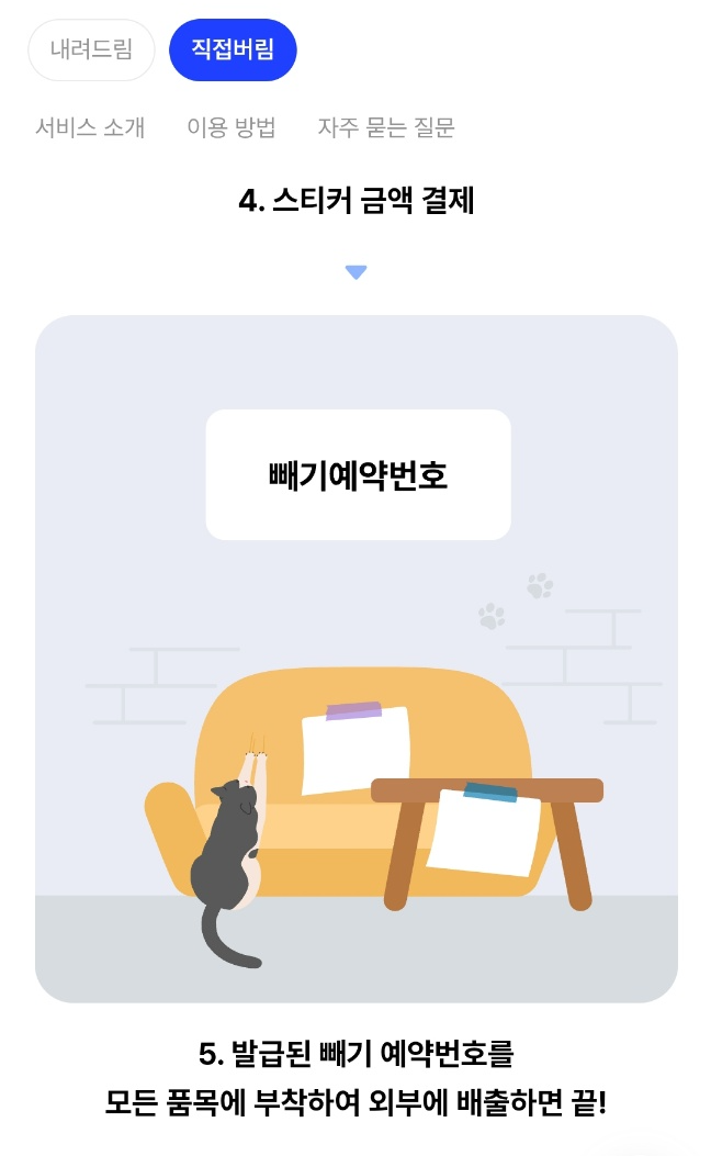 사용자가 직접 배출 장소에 내놓으면 수거하는 서비스로 버릴 품목 선택 후 결제하고, 예약번호를 붙여 내놓습니다. 스티커 구매와 같은 것입니다.