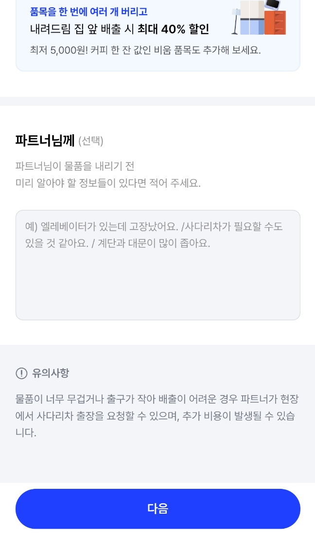 스티커를 별도로 구매해야 하고, 직접버림 서비스 구매 후 예약번호를 페기물에 붙여서 집앞 배출 서비스를 추가로 이용하면 됩니다. 품목과 규격에 따라 비용이 청구되고, 파트너 선정 후 결제하는 과정을 거칩니다.
