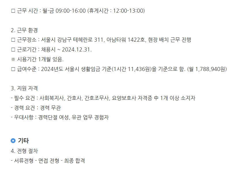 • 자격 요건: 대부분 무경력 지원 가능하지만 사회복지사, 요양보호사, 간호조무사, 장애인활동지원사 등의 자격증 보유자를 우대하는 경우가 대부분임
