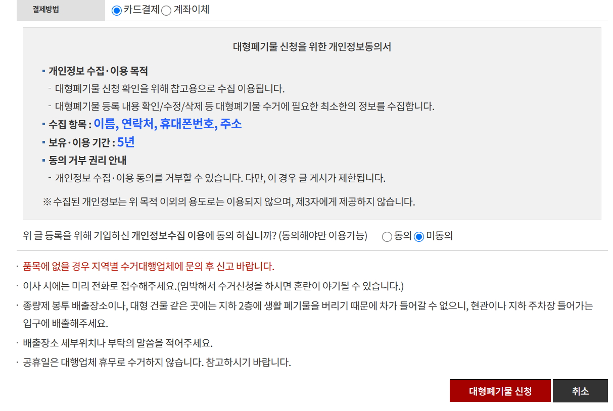 - 카드 결제 취소나 수거 일정 변경은 해당 지역 담당 업체에 문의해야 합니다.