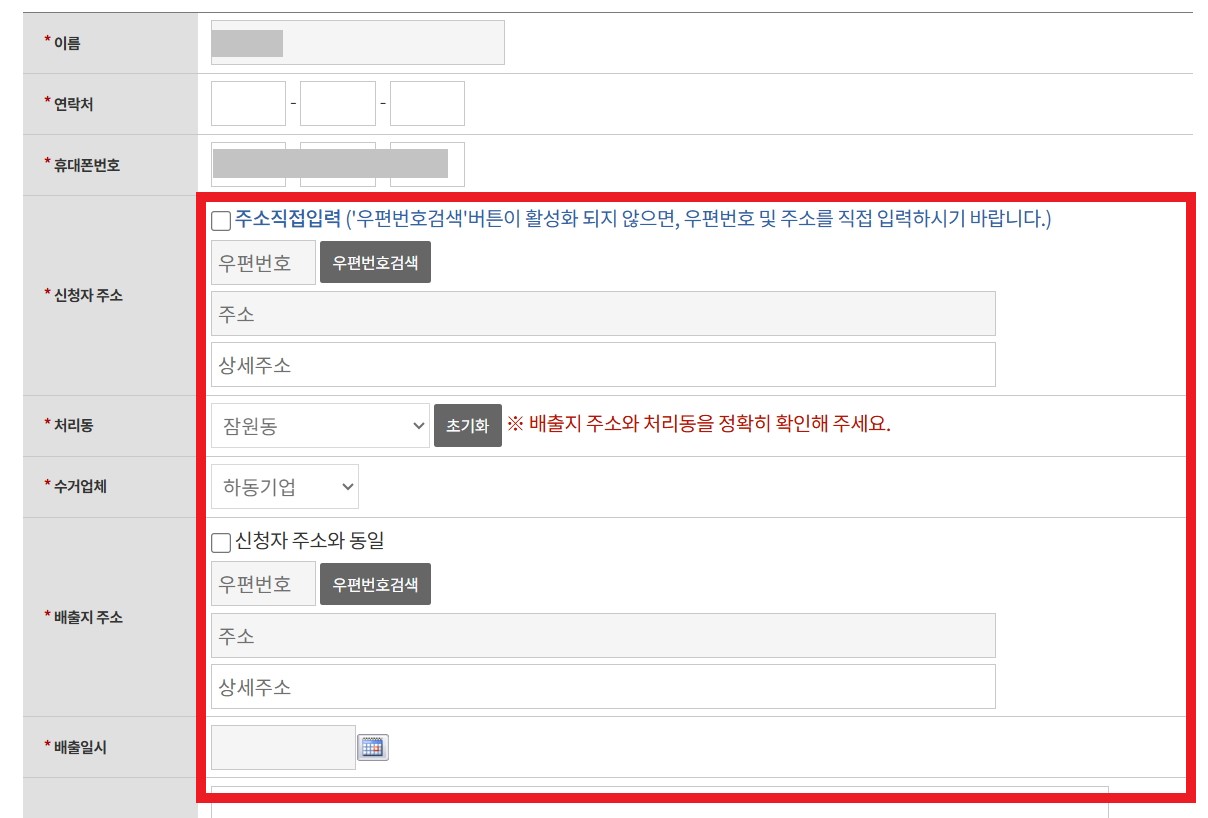 - 주소, 처리동, 배출일시, 배출 장소, 요청사항, 전달사항 등을 자세히 씁니다.