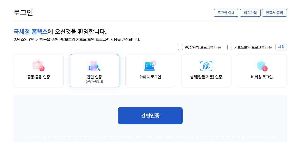 2️⃣ 공동인증서 또는 간편 인증(카카오, 네이버, PASS 등)으로 로그인