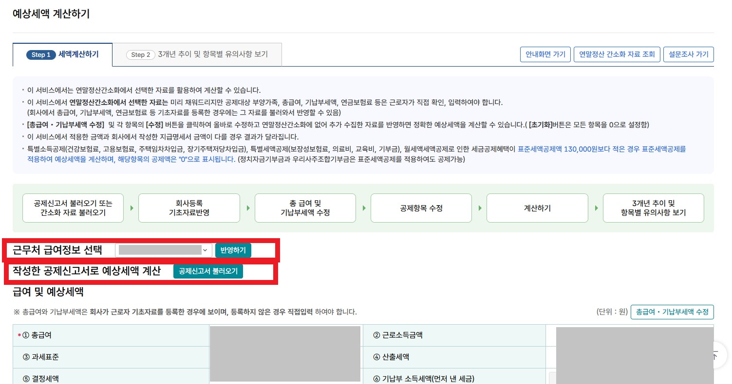 7. '근무처 정보'와 '공제신고서 불러오기'로 예상세액을 계산