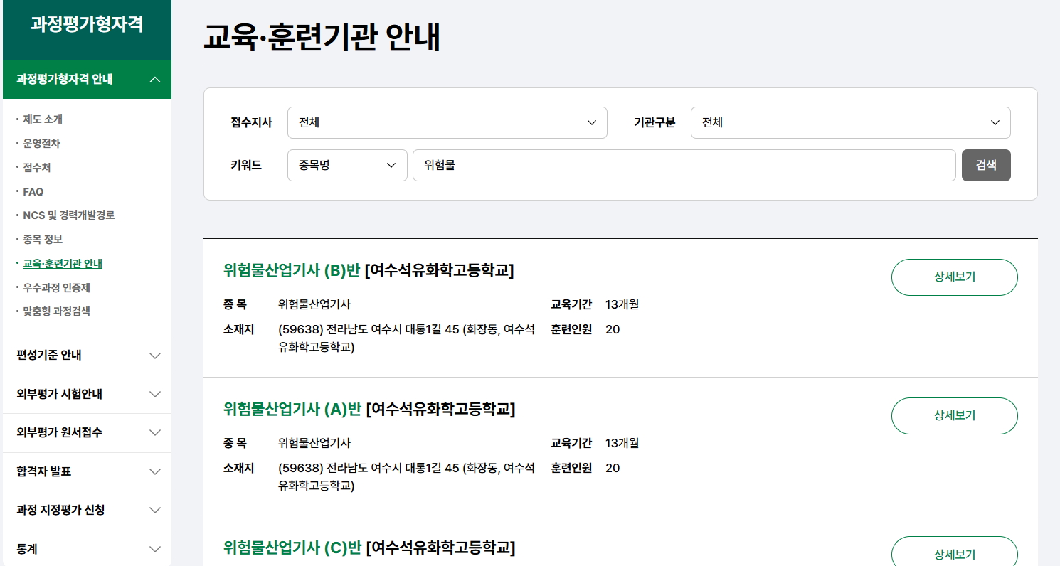 위험물 산업기사 과정평가형 과정을 운영하는 기관, 학교는 아래에서 확인하실 수 있습니다.