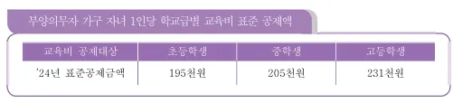 부양의무자의 가정에 초등학생, 중학생, 고등학생이 있는 경우, 그 교육비를 소득에서 차감할 수 있습니다. 이를 표준 공제라고 부릅니다. 예를 들어, 초등학생 한 명당 매달 195,000원, 중학생은 205,000원, 고등학생은 231,000원을 공제받을 수 있습니다.