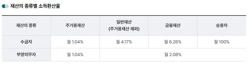 - 일반재산, 금융재산, 자동차, 기타 재산: 매달 재산의 2.08%를 소득으로 환산합니다.