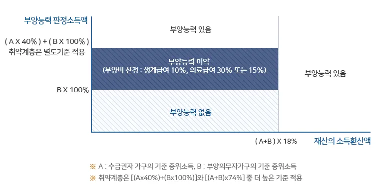 - 부양의무자 재산의 소득환산액이 수급자(A) 가구의 기준중위소득과 부양의무자(B) 가구의 기준중위소득을 합한 금액의 18% 미만이면 부양능력이 없다고 판정합니다.