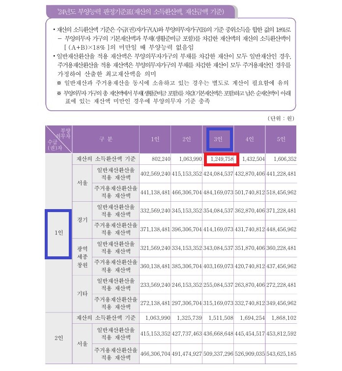 - 부양능력이 있다고 판단되면, 소득이나 재산 중 하나라도 기준을 초과하면 부양 능력이 있는 것으로 봅니다.