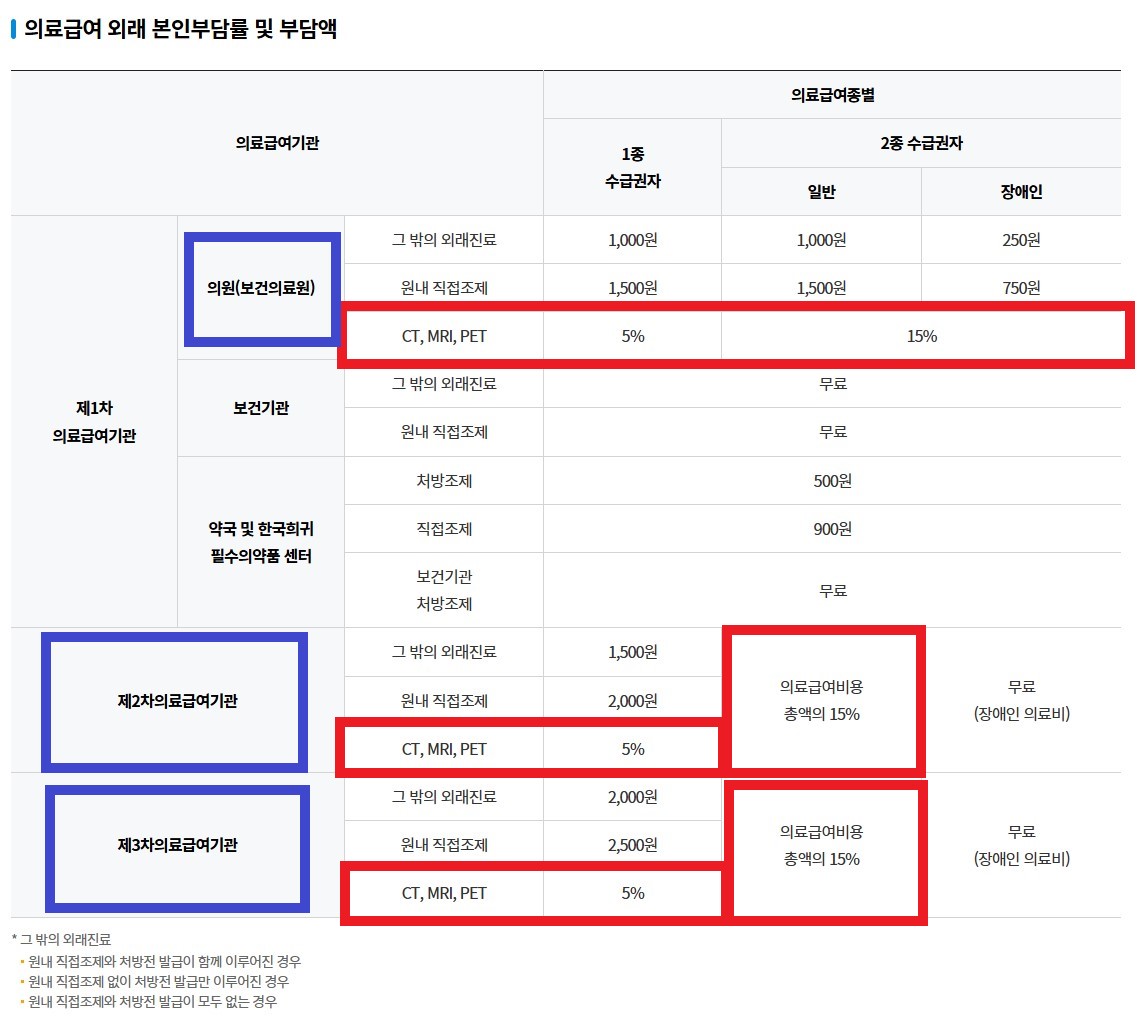 - 1,2,3차 병원 진료 시: MRI를 포함한 의료급여비용 총액의 15%를 본인이 부담합니다.
