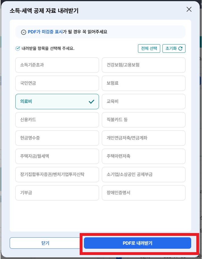 - 소득/세액 공제 자료 내려받기에서 내려받을 항목을 선택하고