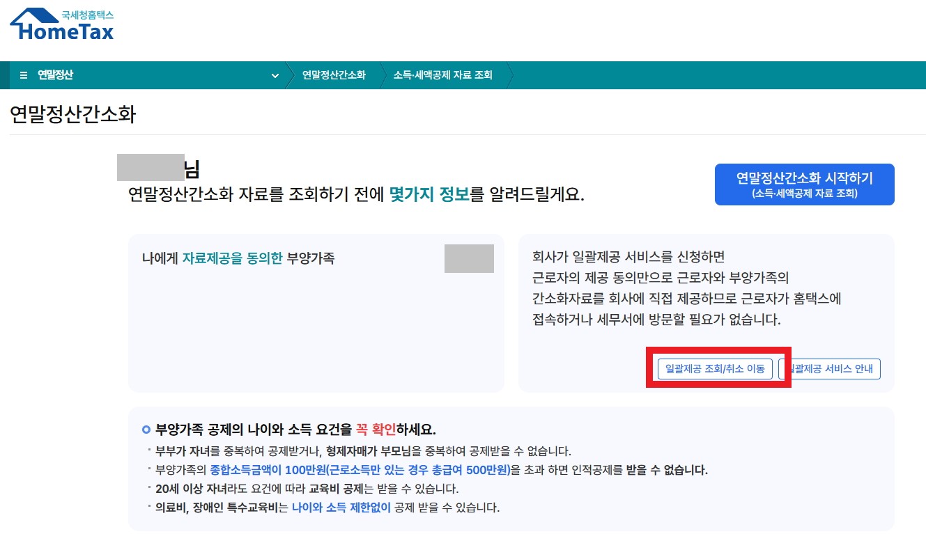 - 연말정산 기간 중 화면에서 일괄제공 신청하기