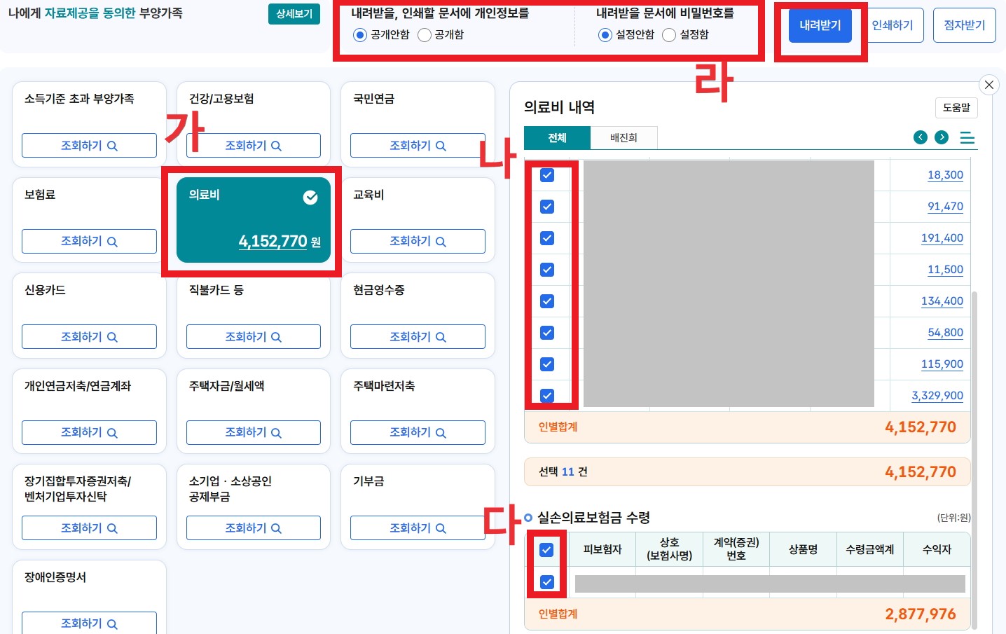 - 가. 의료비를 선택합니다.