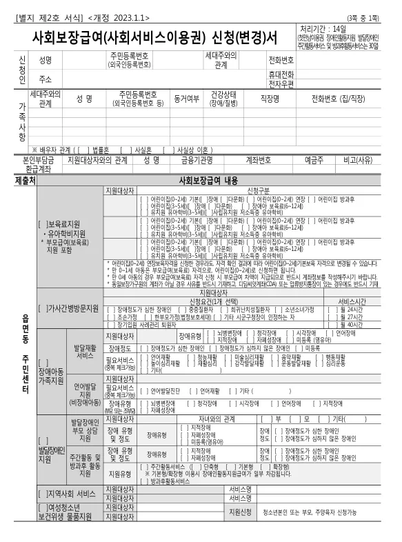 보전급여를 신청하려면 주민센터에서 사회보장급여(사회서비스이용권) 신청(변경)서를 제출해야 합니다.