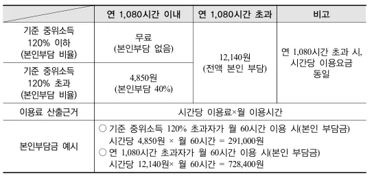 예를 들어, 중위소득 120%를 넘는 가정이 한 달에 60시간 서비스를 이용하면, 291,000원(4,850원 × 60시간)을 내야 하고, 1,080시간을 넘긴 경우는 728,400원(12,140원 × 60시간)을 부담해야 합니다.