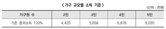 • 중위소득 120%는 정부가 매년 발표하는 가구 소득 기준을 바탕으로 합니다. 가구원 수에 따라 다르며, 예를 들어 4인 가족의 경우 약 6,876,000원이 중위소득 120%입니다.