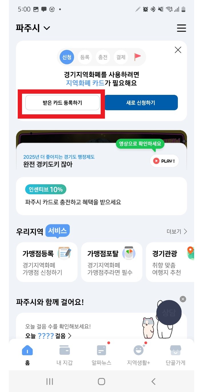 5. 경기지역화폐앱에서 '받은 카드 등록하기'를 선택합니다.