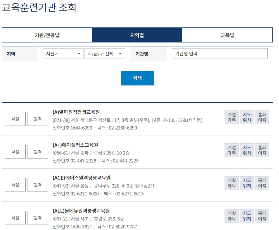 기관/전공별, 지역별, 과목별 교육기관 찾기