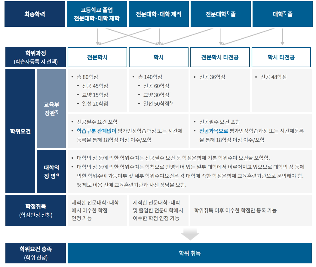 학점은행제를 통해 전문학사(2~3년제 학위, 전문대 과정) 또는 학사(4년제 학위, 4년대 과정)를 취득할 수 있습니다.
