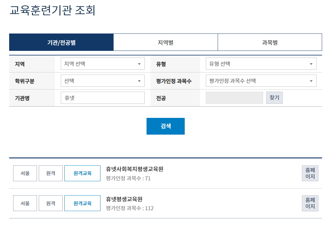 학점은행제 홈페이지에서 교육훈련기관을 조회할 수 있습니다.