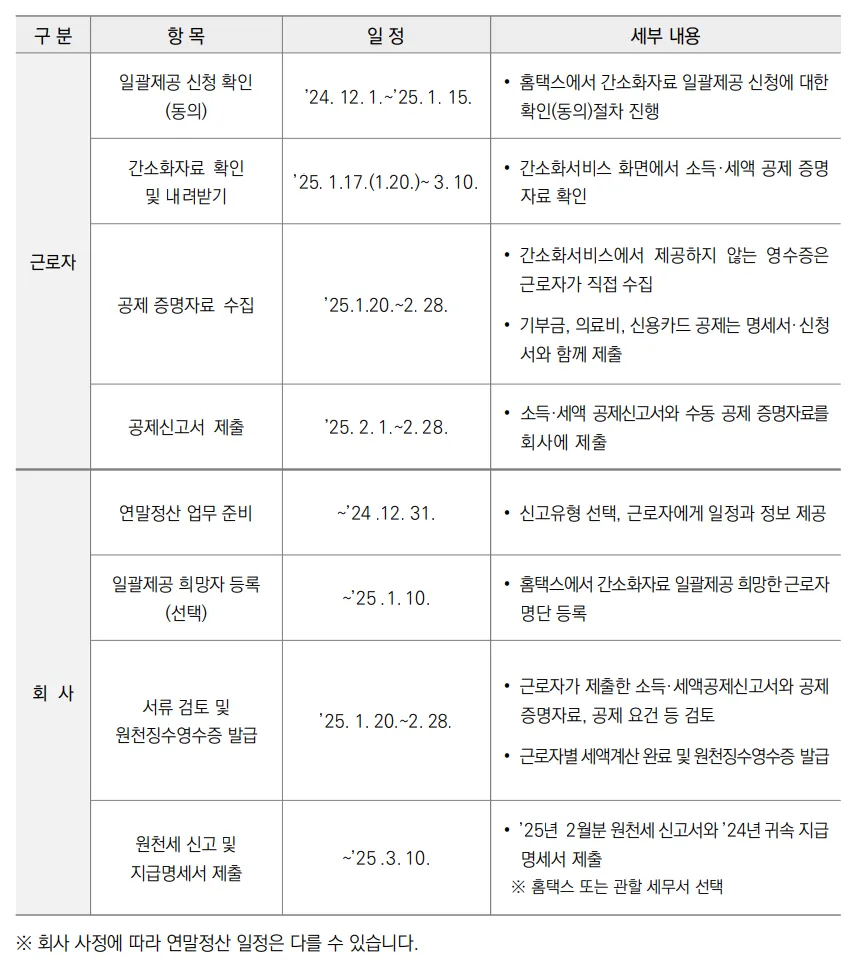 - 회사는 근로자의 기초자료(급여 내역 등)를 시스템에 입력하고, 연말정산 일정과 필요한 정보를 정리하여 근로자에게 안내합니다.