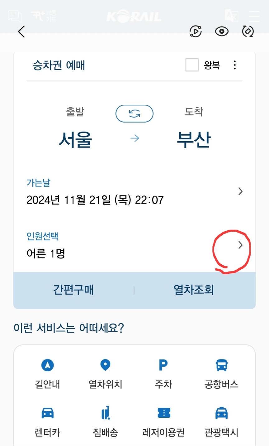- 코레일톡 앱에서 출발지, 도착지 입력 후 인원을 선택합니다.