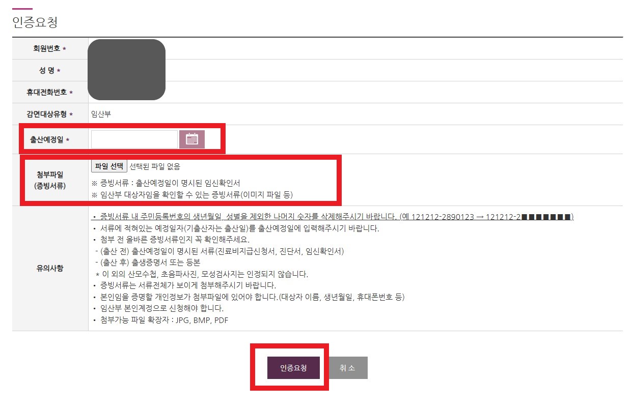 3. 인증요청 부분에서 출산일 또는 출산 예정일을 입력하고 임신확인서를 첨부합니다.
