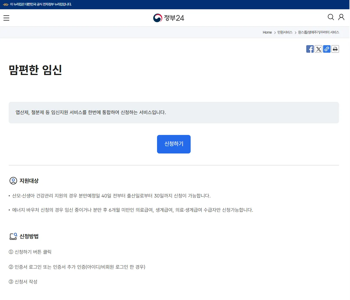 1.아래 링크로 정부24 맘편한 임신 원스톱 서비스를 신청합니다.