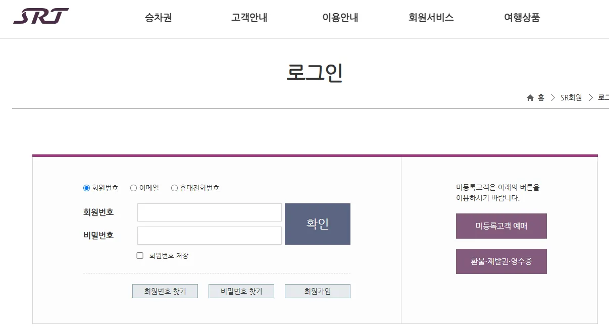 1. 회원가입 및 로그인합니다. SRT 는 코레일이나 KTX와 별도로 운영되므로, 다시 가입해야 합니다. 회원가입시 코레일 회원번호와 별도의 회원번호를 받습니다.