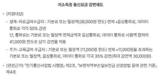생계·의료급여 수급자는 기본료 또는 월정액 요금이 26,000원 한도로 면제되고, 음성 및 데이터 통화료는 각각 50% 감면됩니다. 주거·교육급여 수급자는 기본료 또는 월정액 요금이 11,000원 한도로 면제되고, 초과분은 35% 감면됩니다. 해당 통신사에 직접 문의해 신청할 수 있습니다.