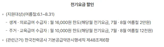 생계·의료급여 수급자는 월 최대 16,000원의 전기요금 할인을 받을 수 있으며, 여름철(7월~8월)에는 최대 20,000원까지 할인이 가능합니다. 주거·교육급여 수급자의 경우 월 최대 10,000원의 할인이 적용되며, 여름철에는 12,000원까지 가능합니다.