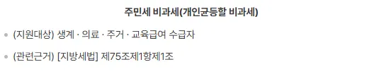 주민세란 각 개인이 내야 하는 세금 중 하나입니다. 생계, 의료, 주거, 교육 급여를 받는 수급자들은 이 세금이 면제됩니다. 이 세금은 따로 신청하지 않아도 시·군·구에서 자동으로 면제 처리해줍니다.