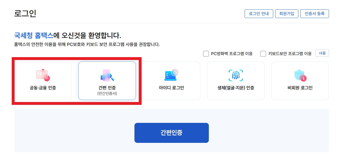 - 간편인증 로그인, 공동/금융인증서 로그인 등이 가능합니다.