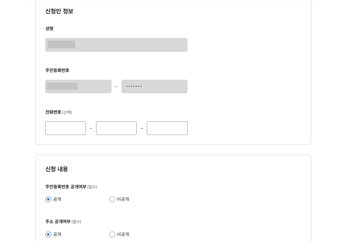 - 주소와 주민번호 공개여부를 선택합니다.