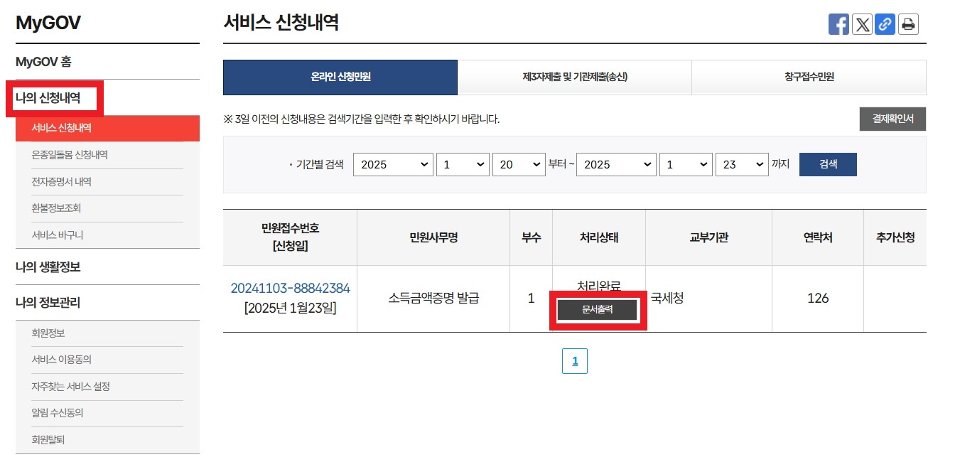 7. 나의 신청내역에서 문서출력을 선택합니다.