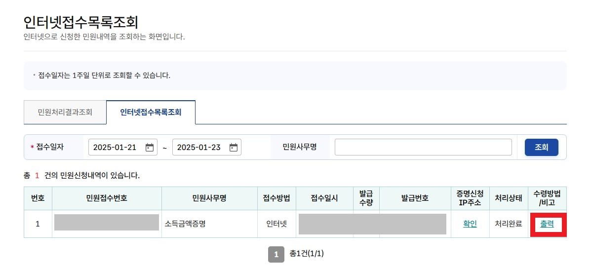 6. 인터넷 접수 목록에서 출력하기를 클릭합니다.