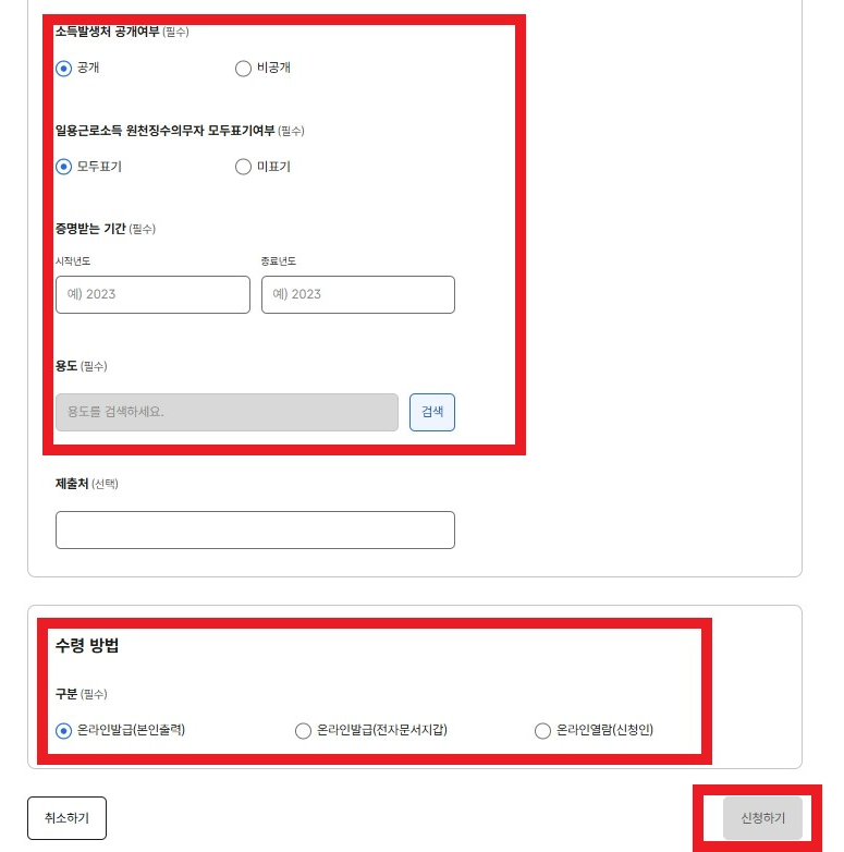 - 발급유형, 발급받고자 하는 과세기간, 소득발생처 공개여부, 사용용도, 제출처를 선택합니다.