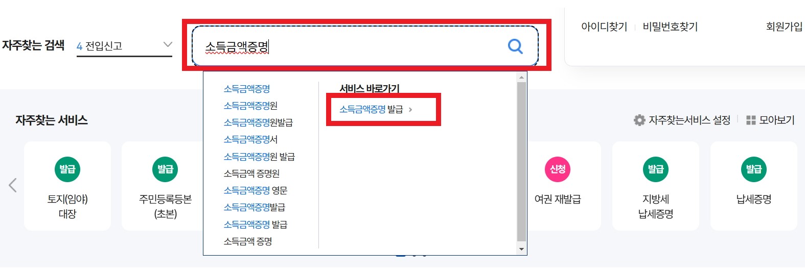 2. 검색창에 소득금액증명 발급을 검색합니다.