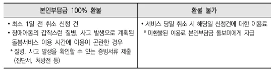 - 서비스 시작 1일 전에 취소하면 본인 부담금을 전액 환불받을 수 있습니다. 하지만 당일 취소 시에는 환불이 불가능합니다. 단, 아이의 갑작스러운 질병이나 사고가 발생한 경우 증빙서류를 제출하면 전액 환불이 가능합니다.