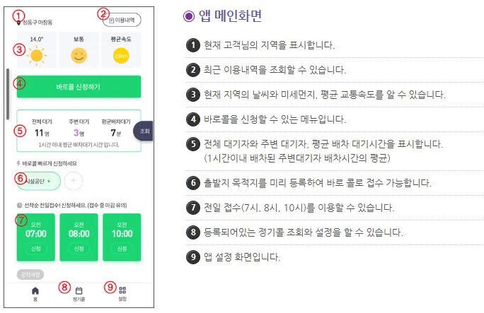 오전 7시, 8시, 10시에 접수한 고객에게 우선 배차되지만, 차고지에서 고객 탑승지까지의 이동 시간이 필요합니다. - 바로콜 접수 시