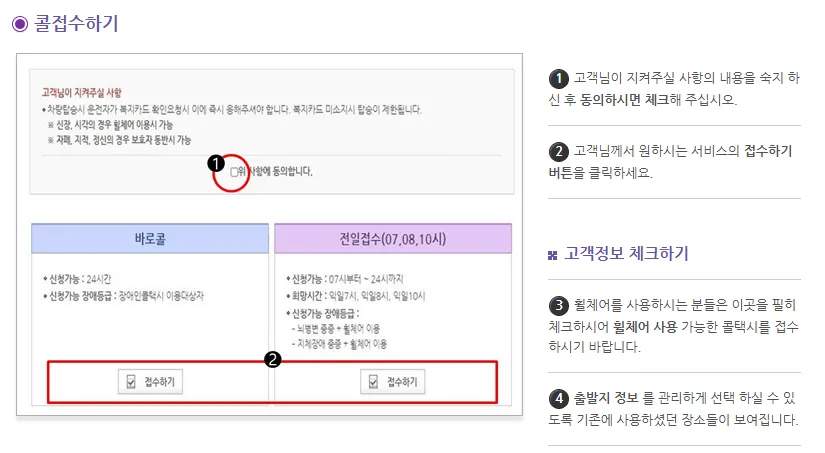 - 전일 접수는 휠체어를 이용하는 중증 장애인만 사용할 수 있으며, 출발 24시간 전부터 07시, 08시, 10시 시간대에 신청할 수 있습니다. 시간대별로 선착순으로 접수됩니다.