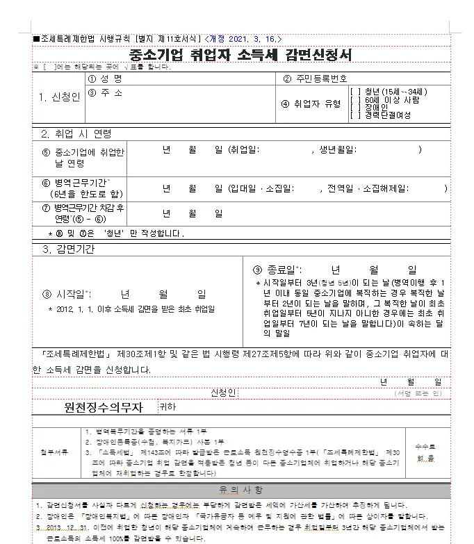 - 2011년 12월 31일 이전에 중소기업에 취업한 사람이 2012년 1월 1일 이후 근로 계약을 연장하거나 다시 고용된 경우, 소득세 감면을 받을 수 없습니다.