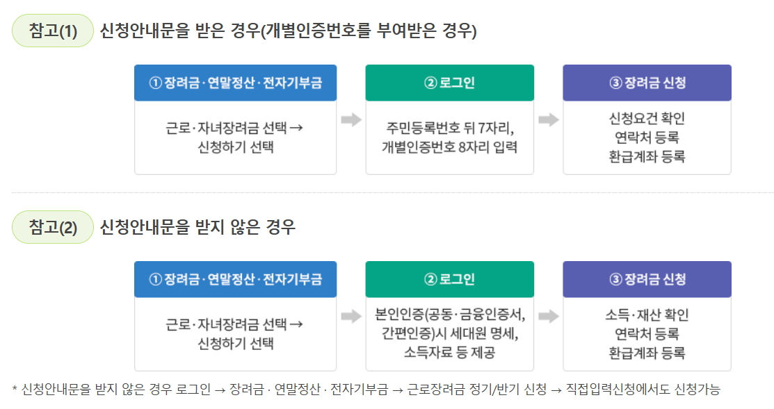 - 2024년 12월에는 2023년 기준 가구·소득·재산 요건을 반영하여 장려금을 지급합니다.